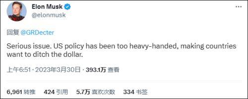 去年3月30日,有一名财经界推特博主发布一系列推文,讨论一段时间以来日益渐起的“去美元化”趋势,她直言“美元正失去其储备货币的地位”,并提到了人民币在贸易结算方面取得的重要进展。对此,美国亿万富翁马斯克也担心起美元影响力的丧失,他在回复中认为,美国的政策过于强硬,导致各国都想要抛弃美元,而由于美国政府开支过大,也让别国承受了美国很大一部分的通货膨胀压力。