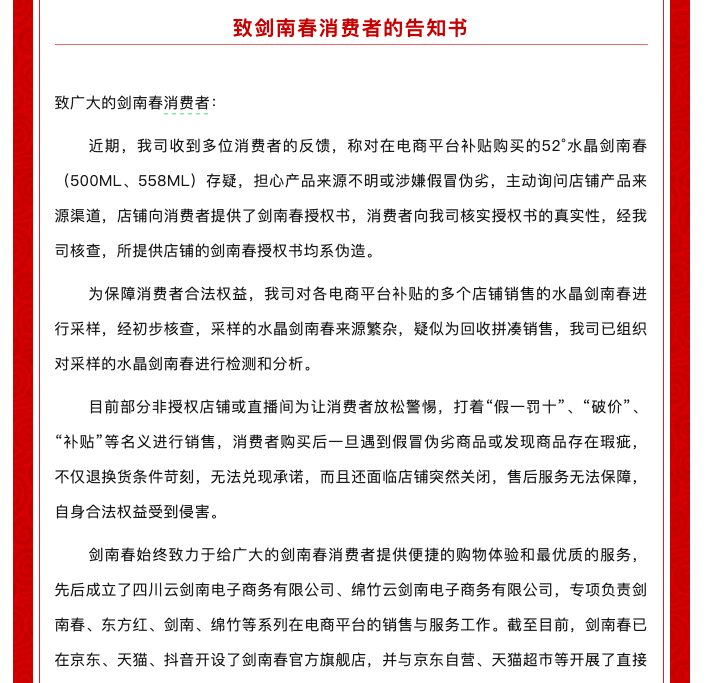 在电商平台上也不乏回收拼凑的酒,剑南春此前10月份就发表《致消费者告知书》表示,目前存在电商平台店铺的剑南春授权书是伪造的现象,经核查,采样的水晶剑南春来源繁杂,疑似回收拼凑销售,公司已组织对采样的水晶剑南春进行检测和分析。