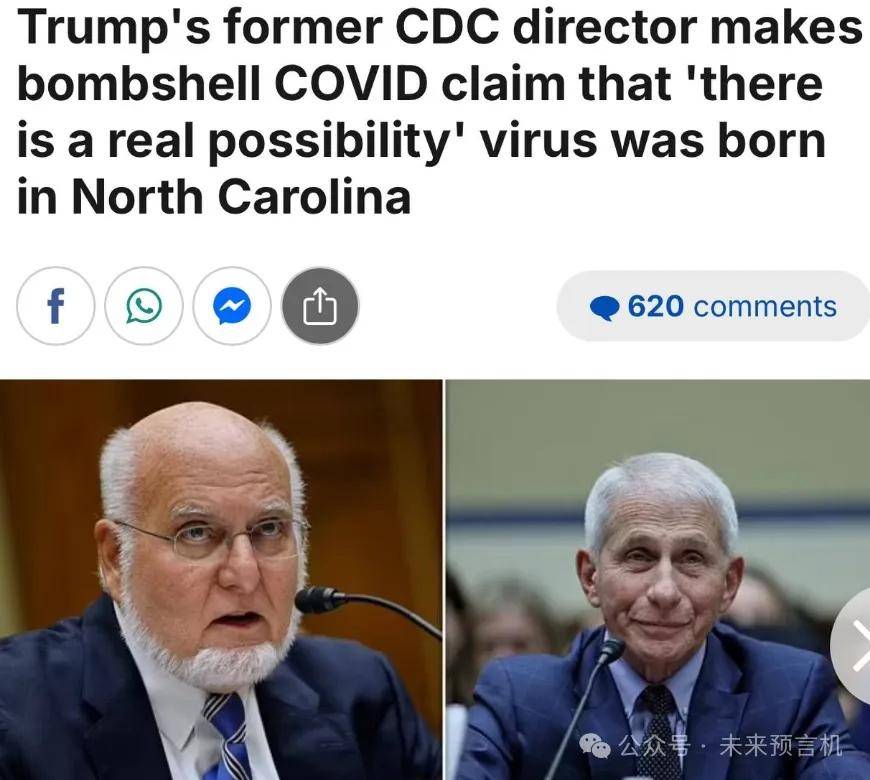 标题翻译:前美国CDC负责人Robert Redfield炸裂声称新冠病毒很可能是在美国北卡莱罗纳(的巴里克的实验室)诞生的。
