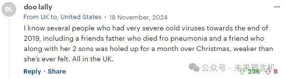 翻译:我认识的几个人在2019年底感染了非常严重的感冒病毒,包括一个朋友的爸爸死于肺炎,还有一个朋友和她的两个儿子在圣诞节期间被隔离了一个月,比她有生以来的患病感觉都要更虚弱。我们都在英国。(注:英国官宣新冠病毒入境是2020年2月,3月2日第一例死亡。)