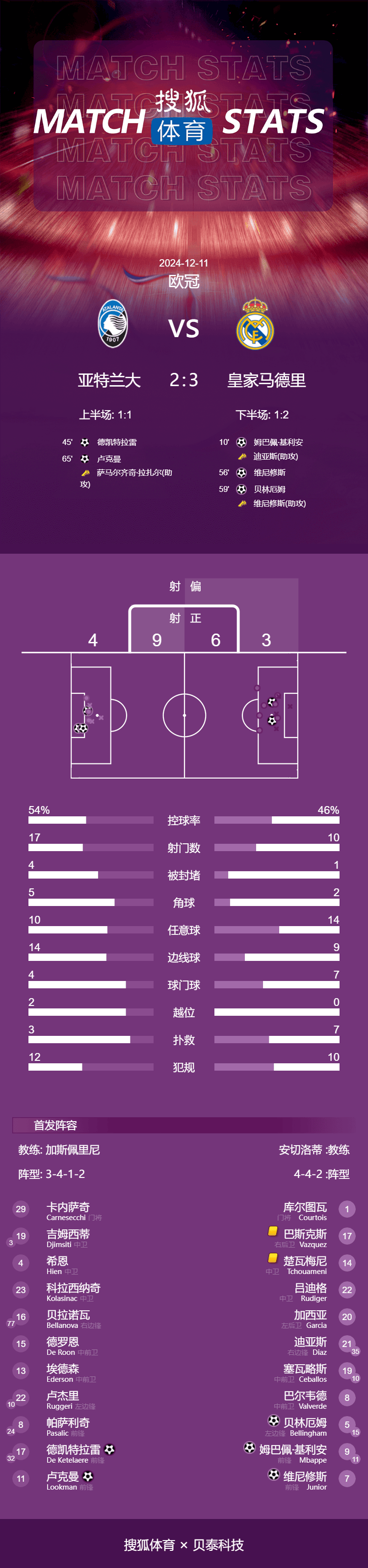 北京时间12月11日凌晨4:00,欧洲冠军联赛24/25赛季小组赛第6轮,亚特兰大在阿祖里球场迎战皇家马德里。上半场,姆巴佩为皇马首开纪录,德凯特拉雷点球扳平。下半场,维尼修斯和贝林厄姆为皇马扩大比分,卢克曼为亚特兰大追回一球。最终,皇家马德里3-2战胜亚特兰大,结束欧冠两连败。