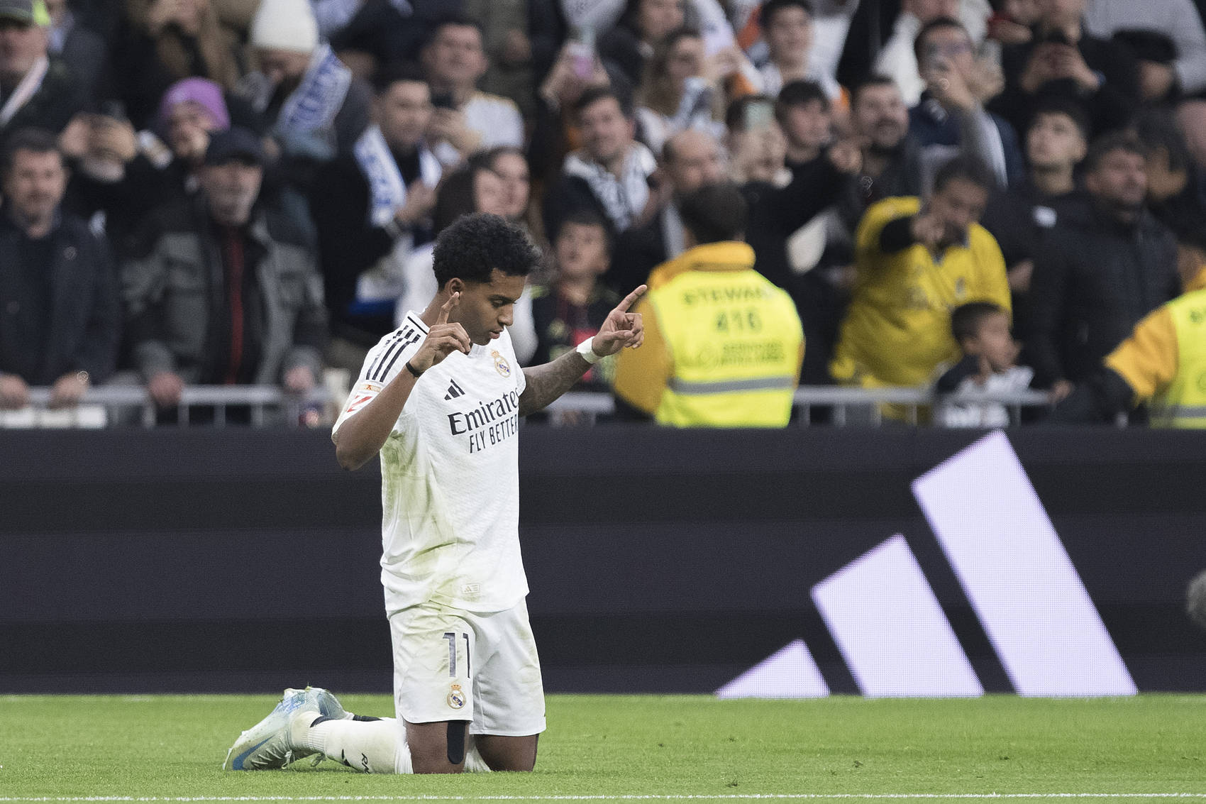 前10分钟的比赛,两支球队互有攻守,踢得非常胶着,但是都没有形成好的射门机会。第11分钟,罗德里戈前场左侧拿球内切后横传,弧顶前沿姆巴佩无人盯防,调整之后右脚轰出世界波,费尔南德斯飞扑不及,皇马主场1-0领先塞维利亚。