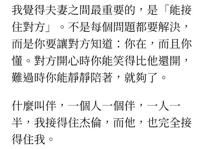 昆凌说:“我们也会吵架,也会因为看法及态度问题而起争执,但我觉得夫妻之间最重要的,是‘能接住对方’。不是每个问题都要解决,而是你要让对方知道:你在,而且你懂。对方开心时你能笑得比他还开,难过时你能静静陪着,就够了。什么叫伴,一个人一个伴,一人一半,我接得住杰伦,而他,也完全接得住我。”