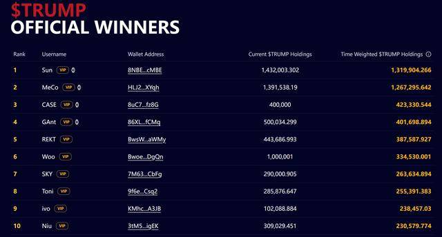 不过要挤进前25名,只需要在活动期间平均持有约17万个“特朗普币”就行了。而作为参加特朗普晚宴的门槛,第220名参与者在活动期间日均持有4196个“特朗普币”。