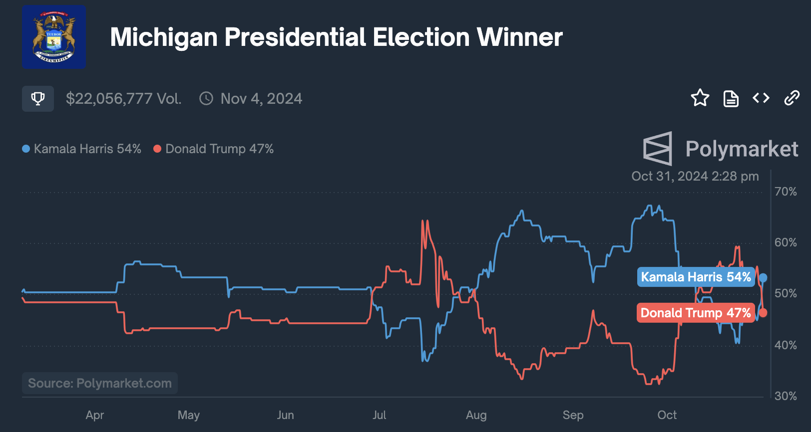 在密歇根州,哈里斯的支持率领先特朗普0.4%(RCP)、1.0%(538)、1.7%(270)。538的数据显示,哈里斯自10月以来在该州从未被超越。RCP的数据显示,尽管特朗普10月20日前在该州领先哈里斯,但此后领先幅度迅速下降,直至29日被哈里斯反超。