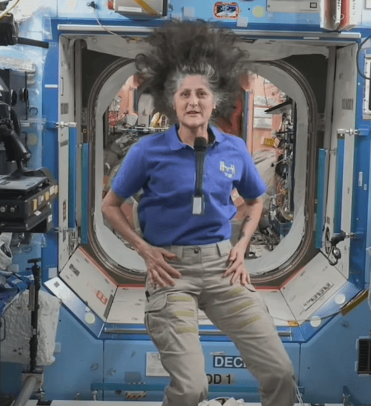 她对小朋友解释说,她的脸型之所以在照片里看起来很奇怪,主要是因为“体液转移”现象,而全美国的宇航员中约有一半人曾经都受到过“体液转移”的影响。苏尼塔说:“人们在太空的时候,有时候头部等位置会显得大一些,这是因为人体内的体液在全身更快地转移流动,所以看上去会有些奇怪。”