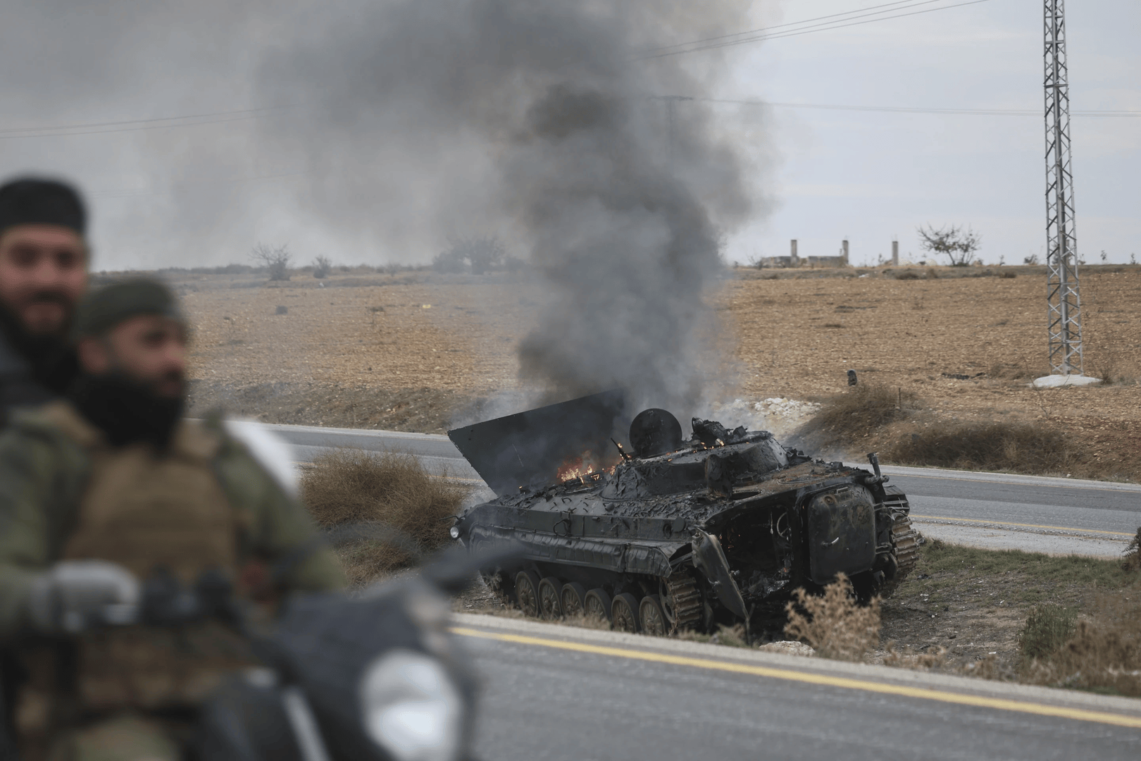 ▲12月7日,叙利亚反对派武装分子驾车经过叙利亚哈马南部一辆政府军装甲车