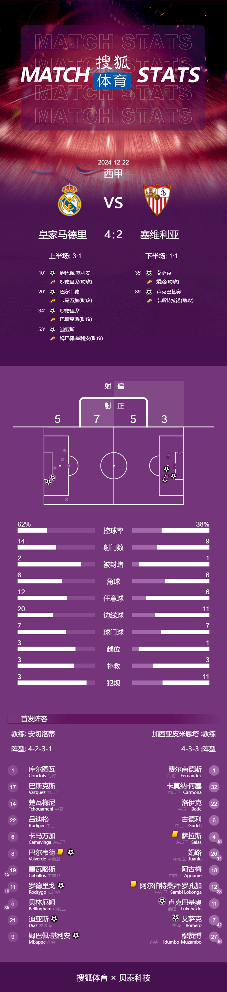 下半场比赛,双方易边再战。第53分钟,巴斯克斯前场右侧拿球给肋部,姆巴佩不停球做球给禁区里,迪亚斯插上形成单刀,调整后左脚推射破门,皇马4-1塞维利亚。