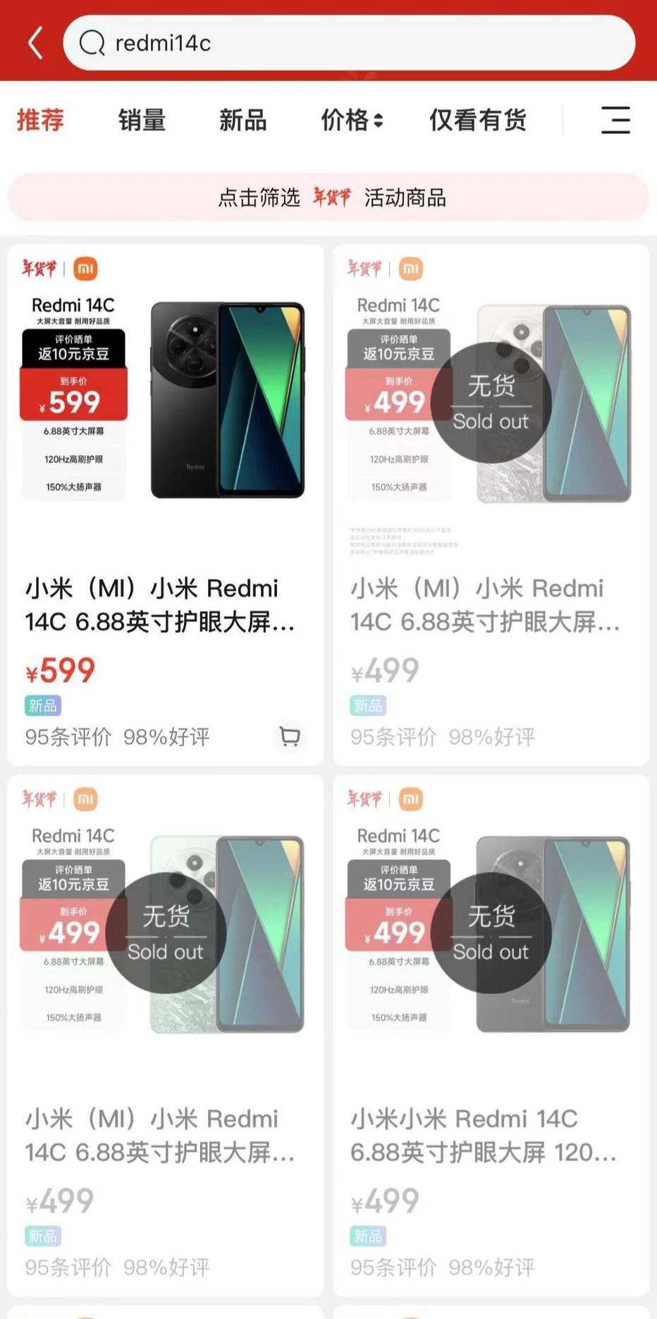 据悉,REDMI 14C于2024年12月30日正式发布,没有发布会、没有明星代言人,但是上市短短几天内,记者查询小米商称、京东小米自营旗舰店、天猫小米官方旗舰店发现,一些机型已显示缺货。