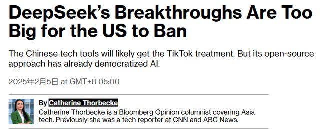 这篇文章的作者名叫凯瑟琳·索贝克(CatherineThorbecke),是彭博社关注亚洲科技动向的专栏作家。在一篇于2月5日发布的文章中,索贝克首先表示尽管她个人非常希望看到一个中美在科技领域携手前进,良性竞争的局面,但她认为在当下的地缘政治氛围下,美国政府最终还是会像对待其他来自中国的科技产品一样,打着国家安全的旗号对DeepSeek下手封杀。