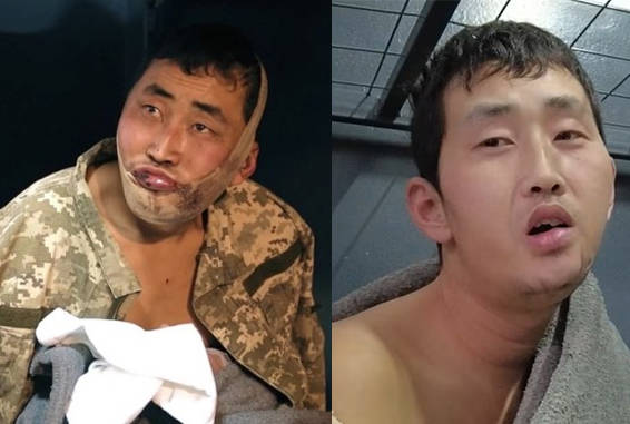 “我们组有三个人,组长和另一名士兵中弹倒地后,只剩下我一个人。所以我也拼命地在地面开枪,我在通往有利于隐蔽的地形的路上中弹了。……子弹穿过我的手臂,打断了骨头,削开了下巴,下巴都碎了。然后我就昏过去了……应该是因为失血过多才昏倒的。睁开眼一看,已经是晚上了。我是凌晨中弹的。然后我想起来,扶着脑袋抬起头,但贫血让我感到眩晕………我在那里坐了好久,在按照原路返回的时候,遇到了我们(朝鲜)的军人。但不是我们中队的,是我们大队的其他中队。他们像这样给我(在下巴和胳膊)缠上了绷带。”