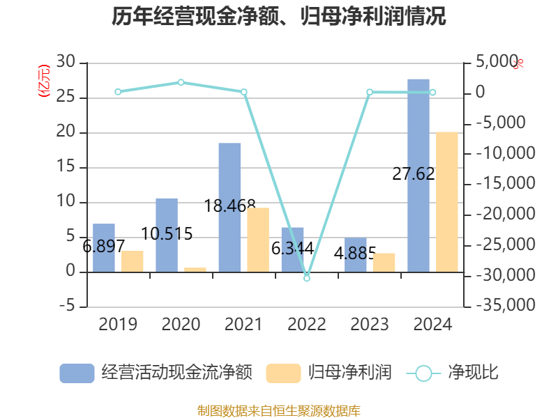 截至2024年,公司经营活动现金流净额为27.63亿元,同比增长465.51%;筹资活动现金流净额-17.23亿元,同比减少49.29亿元;投资活动现金流净额-14.4亿元,上年同期为-25.37亿元。